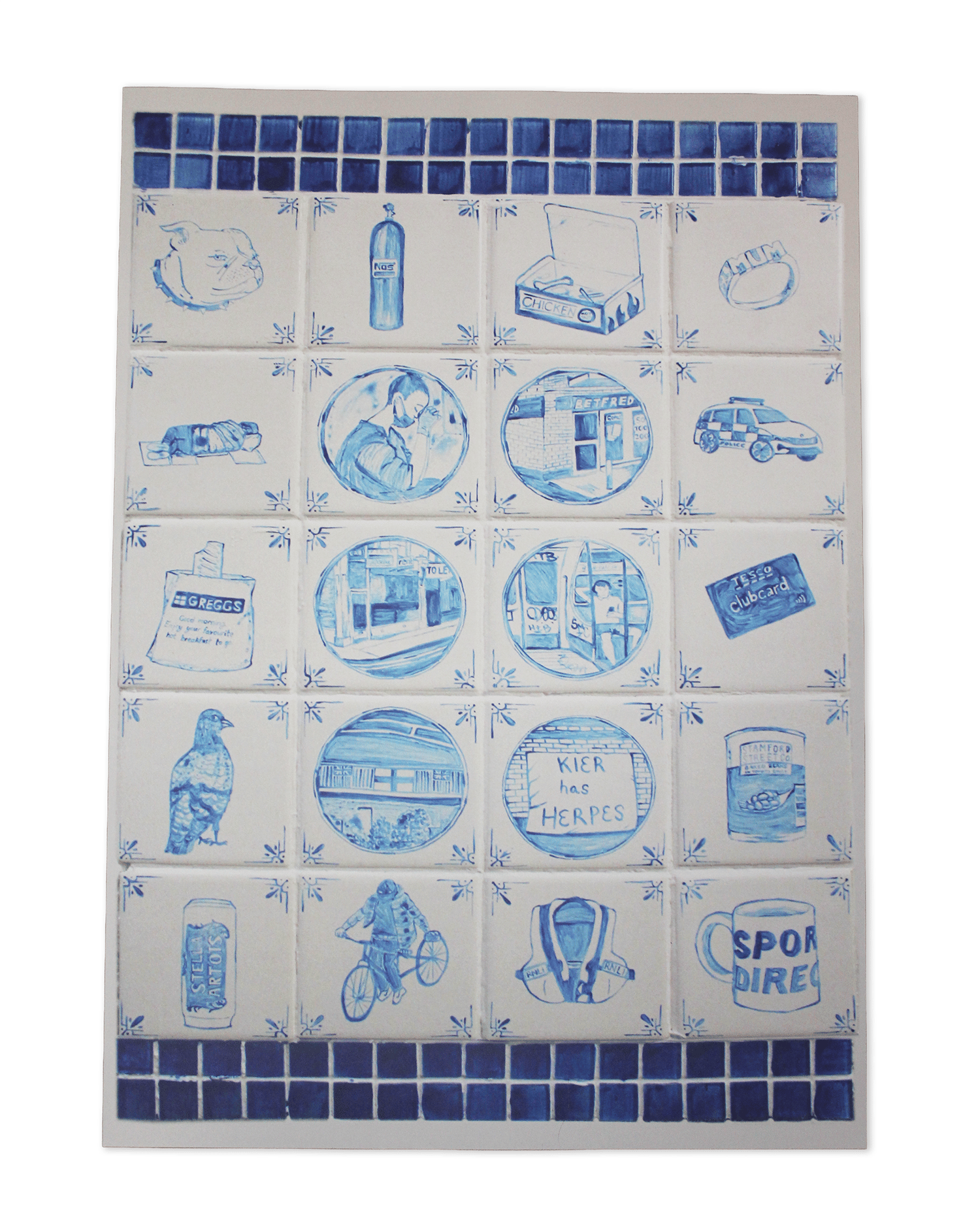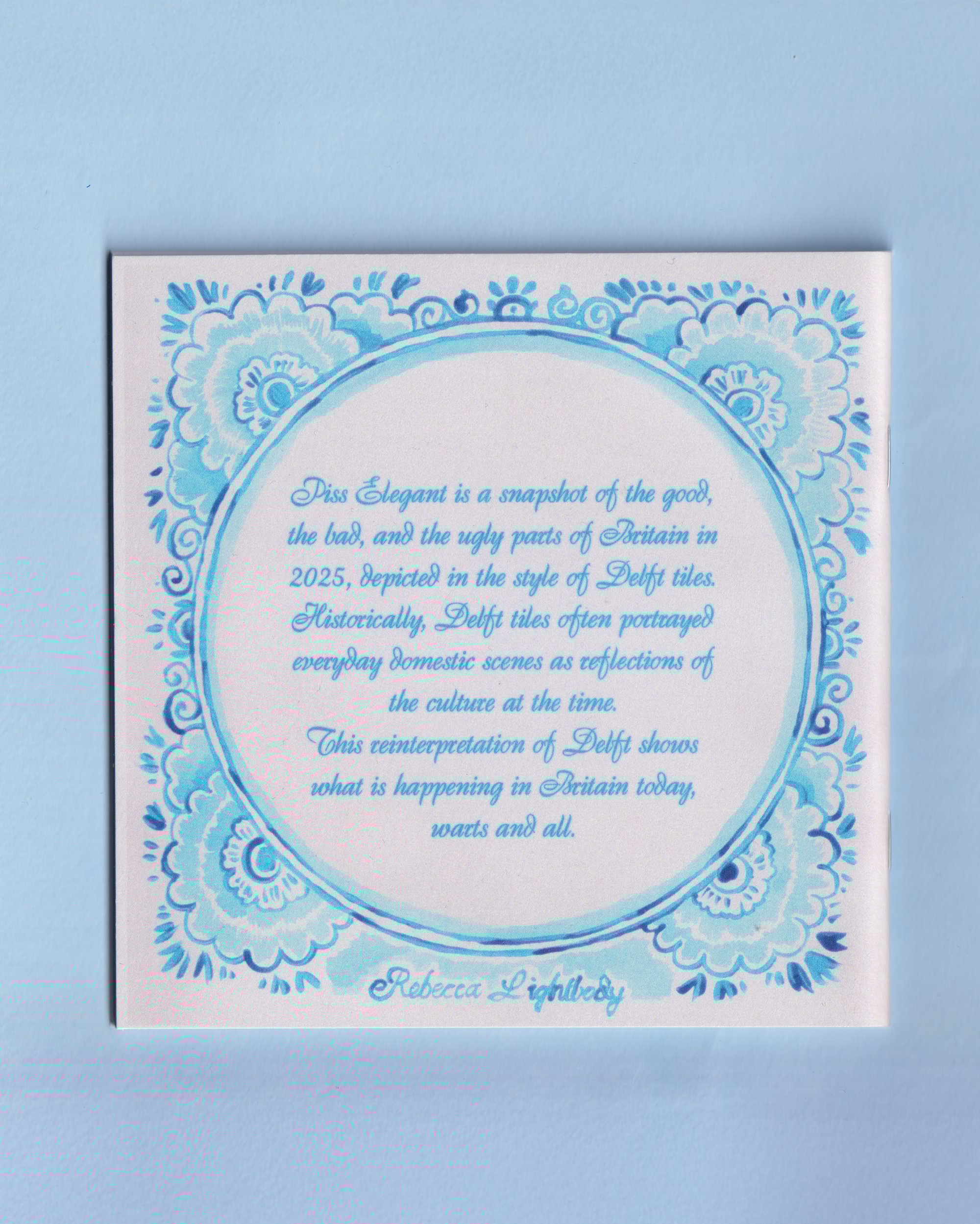 Piss Elegant is a snapshot of the good, the bad, and the ugly parts of Britain in 2025, depicted in the style of Delft tiles.